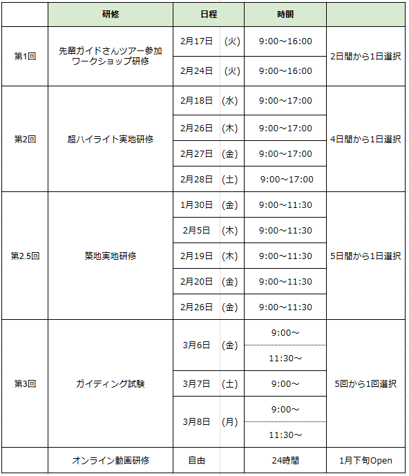 ※早めにガイド試験の準備されたい方は、築地実地研修1月30日(金)の回の受講をおすすめいたします。